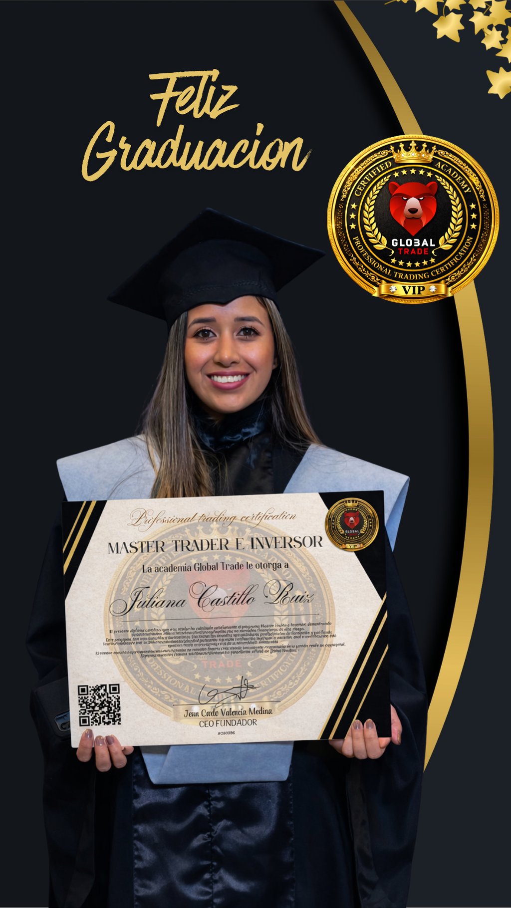 La certificación emitida por Global Trade acredita la culminación satisfactoria del programa académico y respalda la adquisición de competencias profesionales en trading de índices sintéticos, dentro de un marco educativo formal, estructurado y alineado con estándares de formación superior.